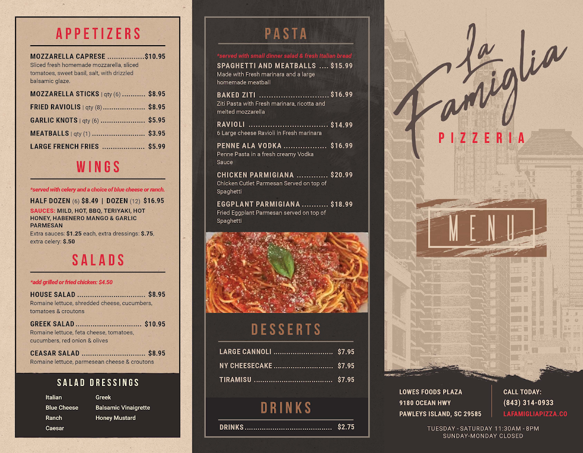 La Famiglia Pizza offers a straightforward, inviting menu that fits perfectly with its relaxed, friendly atmosphere. You’ll find a variety of classic and comforting dishes designed for casual meals with family and friends, whether you're dropping by for a quick lunch or settling in for a cozy dinner.